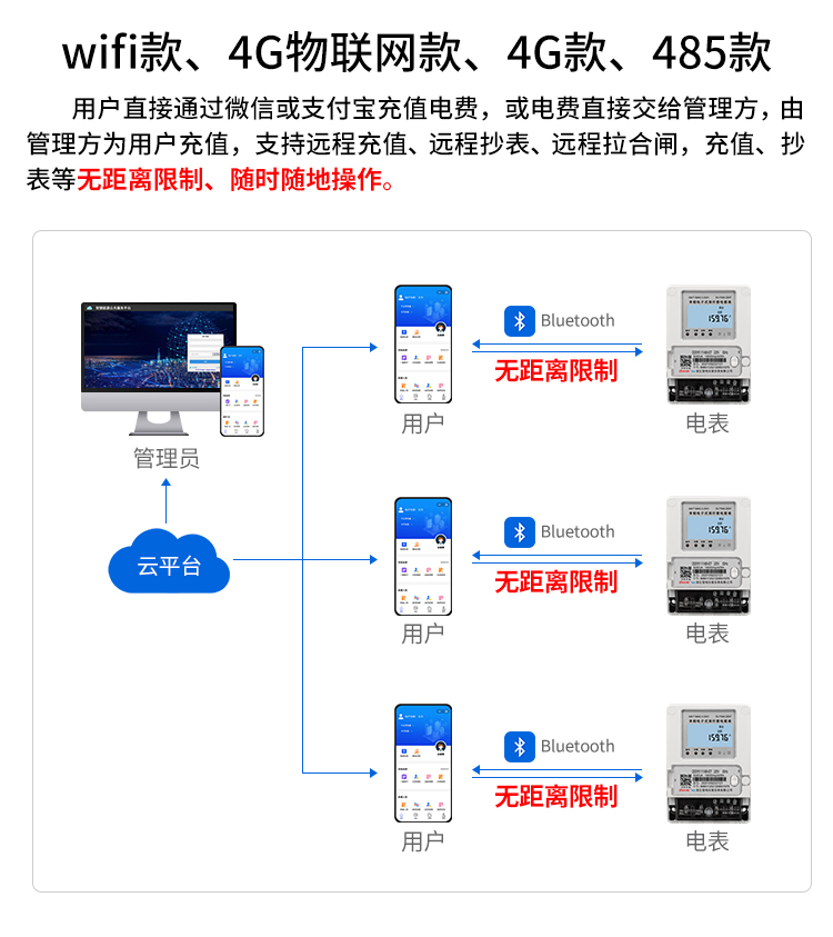 b. 智能電表內(nèi)置通信模塊,通過網(wǎng)絡(luò)與物業(yè)或房東連接,定期將用電數(shù)據(jù)傳輸?shù)轿飿I(yè)或房東數(shù)據(jù)庫中。